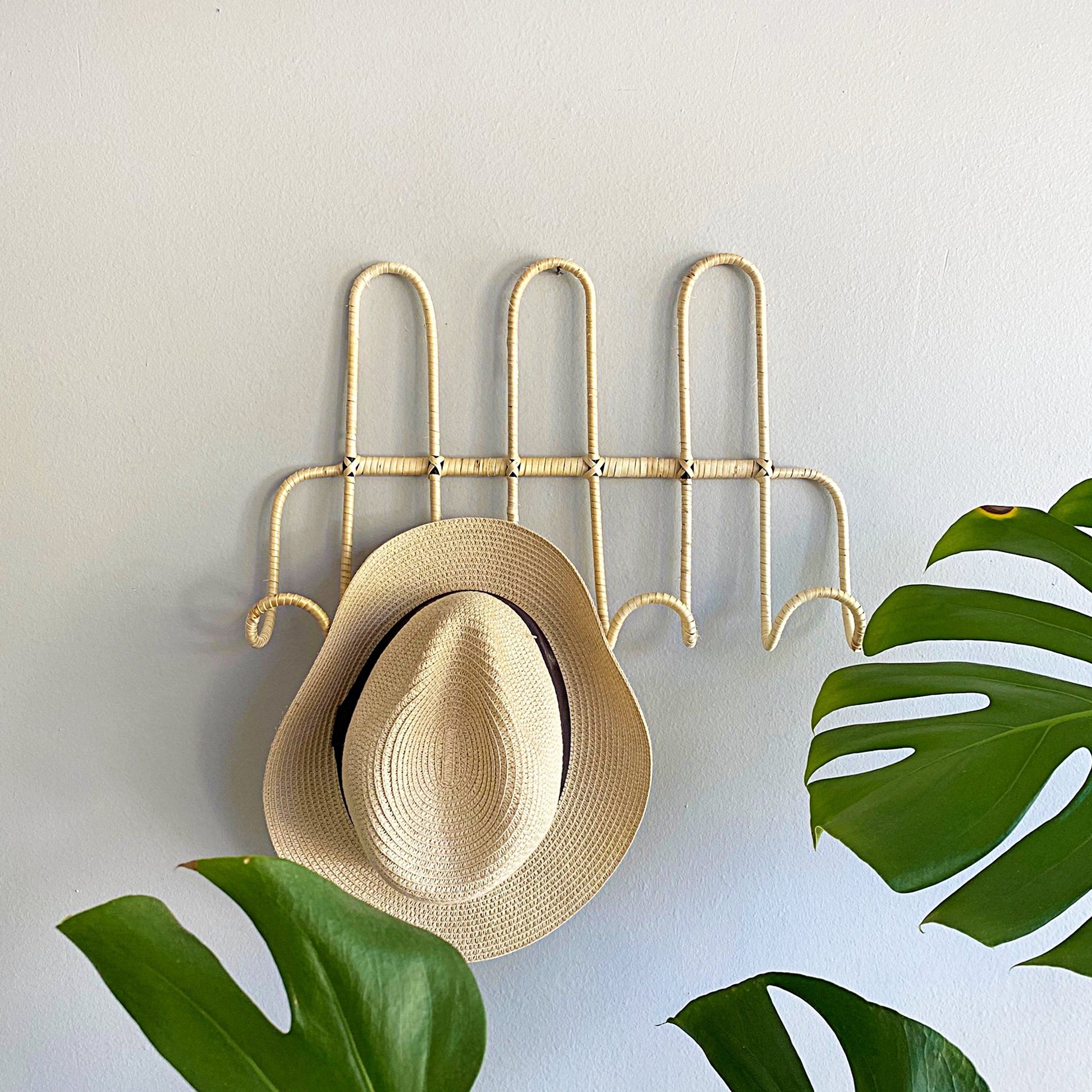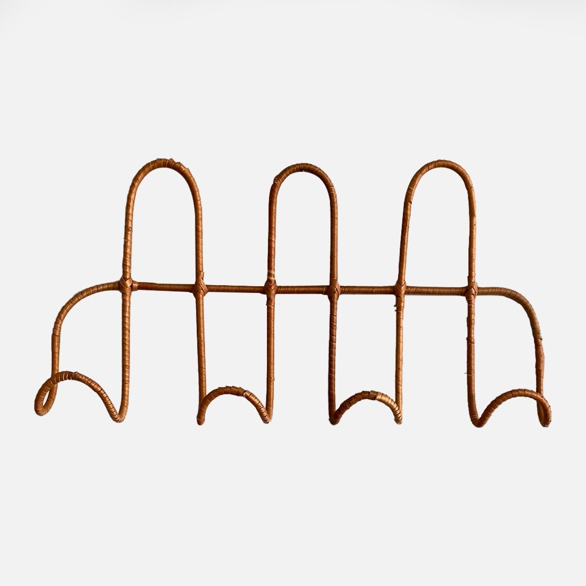Lindo perchero de fierro embarrilado en mimbre ideal para la entrada de tu casa o para mantener el orden en la pieza de tus hijos.